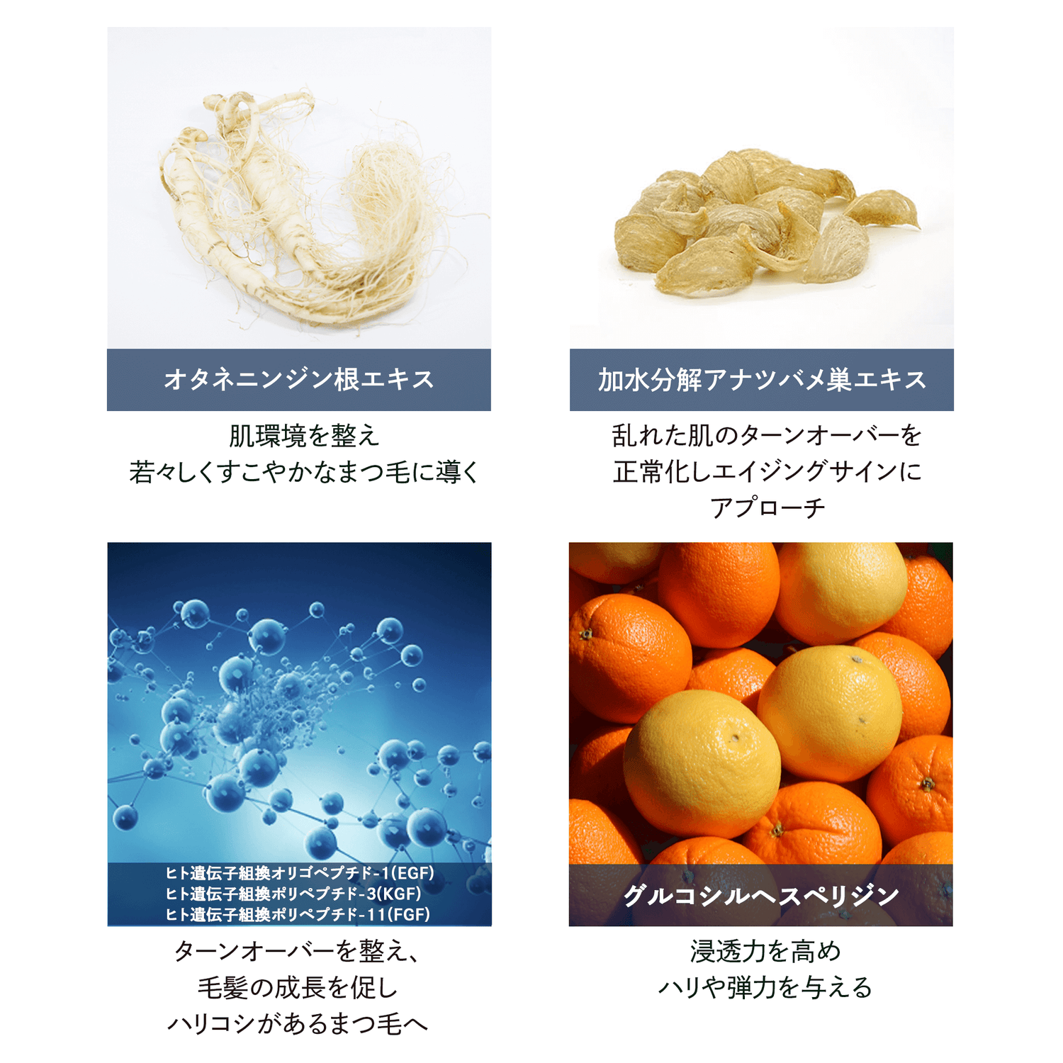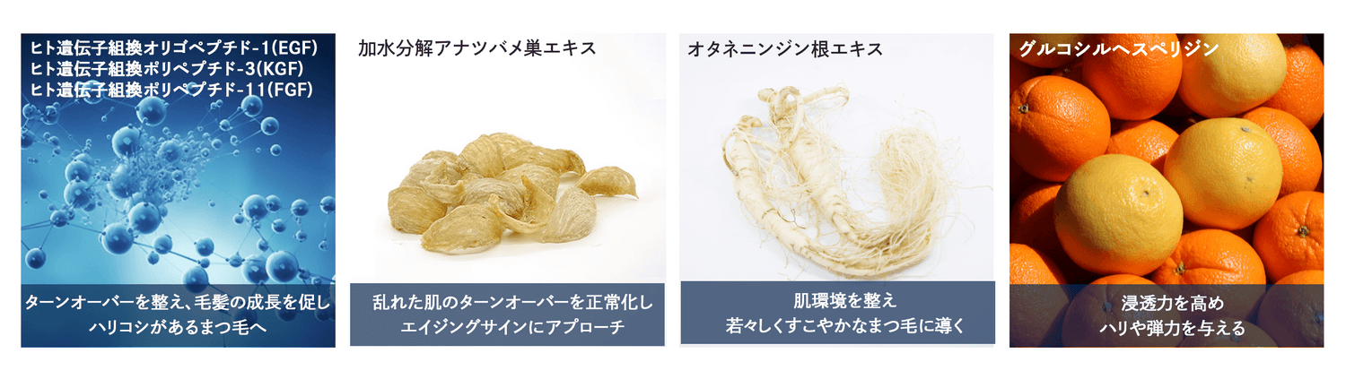 ヒトプラセンタ幹細胞順化培養液のほかに、まつ毛のあらゆる悩みにアプローチする成分を厳選して配合。