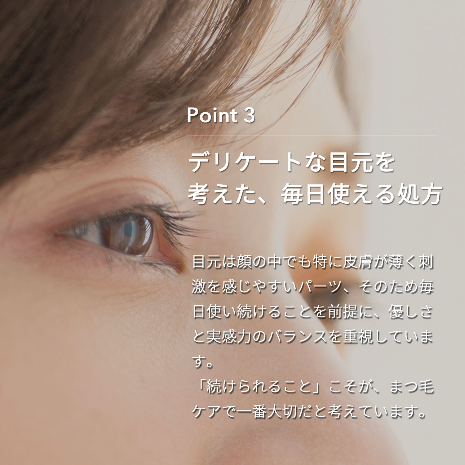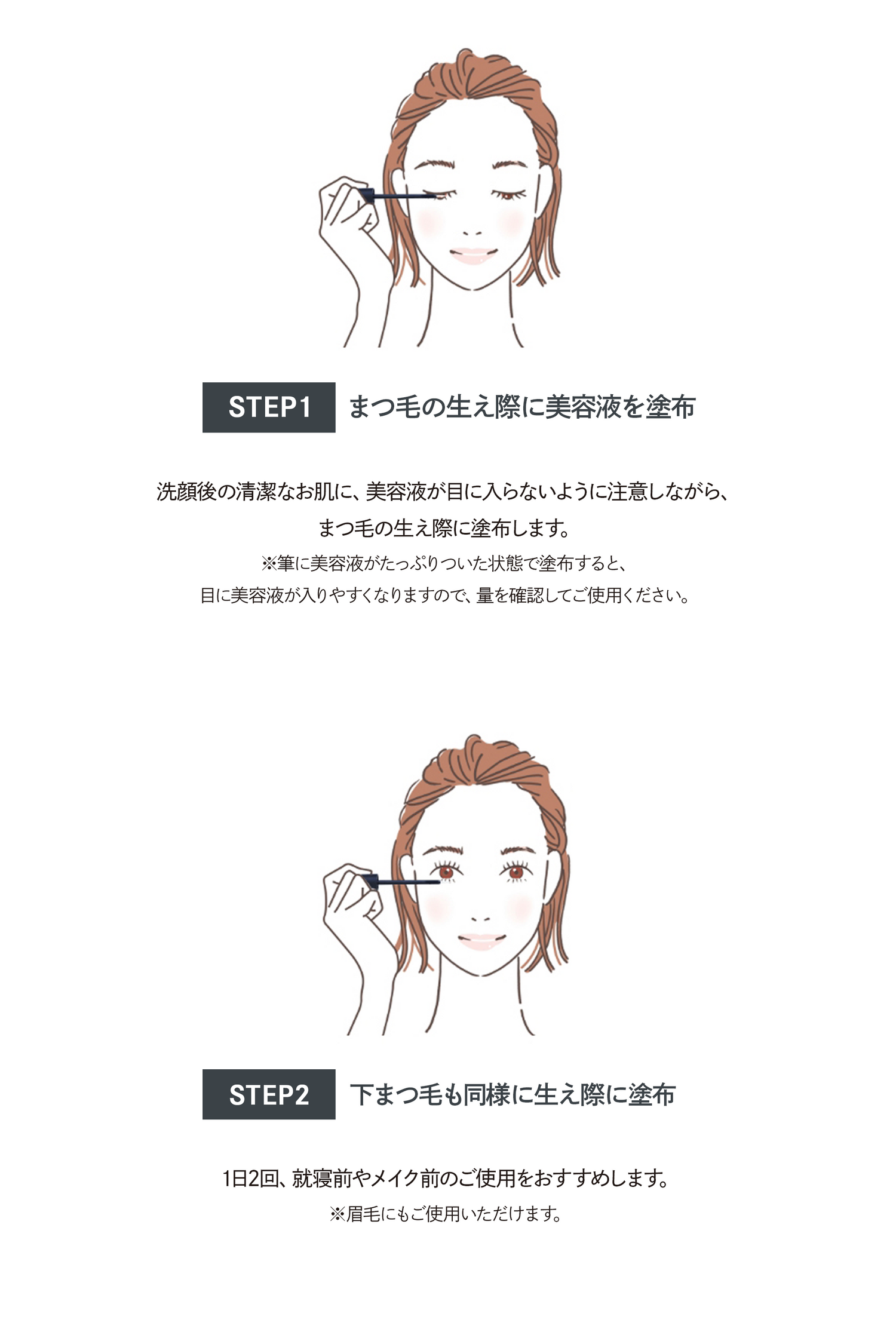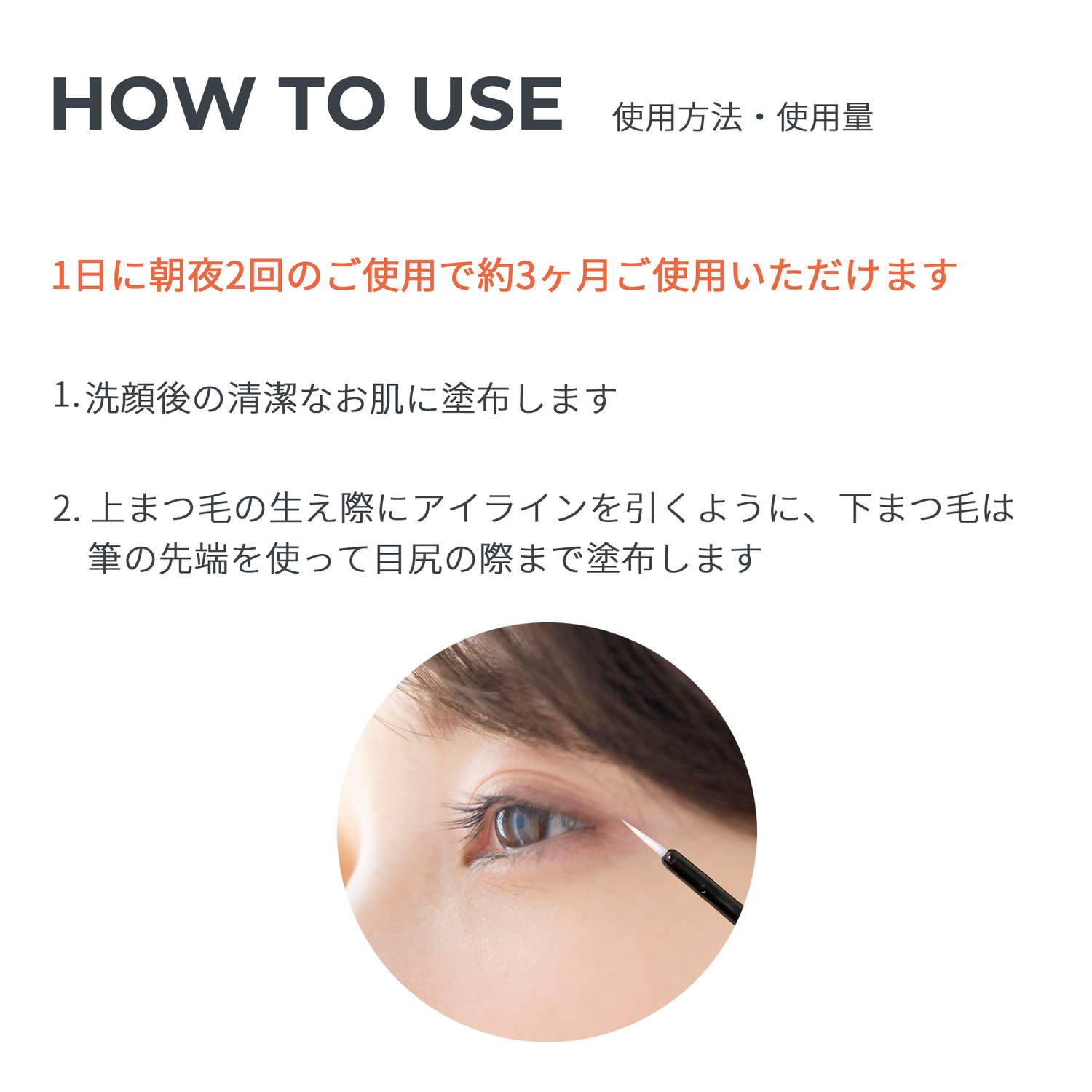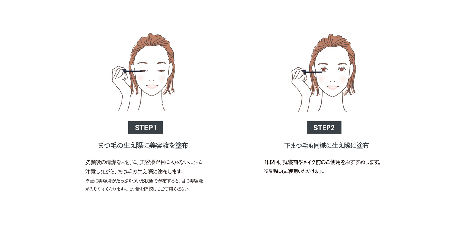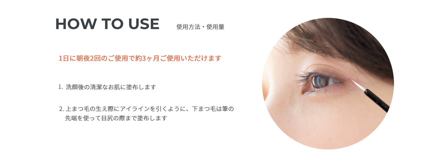 洗顔後、化粧水の前にご使用ください。美容液が目に入らないように注意しながら、まつ毛の生え際に塗布してください。朝夜の1日2回のご使用をおすすめします。