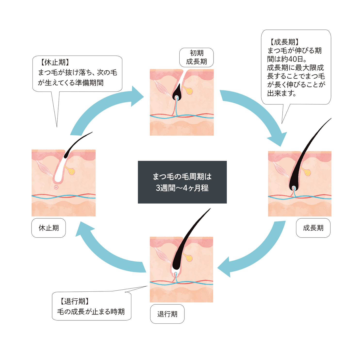 1本のまつ毛が成長しはじめてから抜け落ち、そしてまた新たなまつ毛が生まれるといった一連の流れを毛周期と言います。アイメイクやクレンジングによる負担やまつ毛エクステやパーマなどの外的ダメージ、ストレスなどがまつ毛が抜ける原因です。