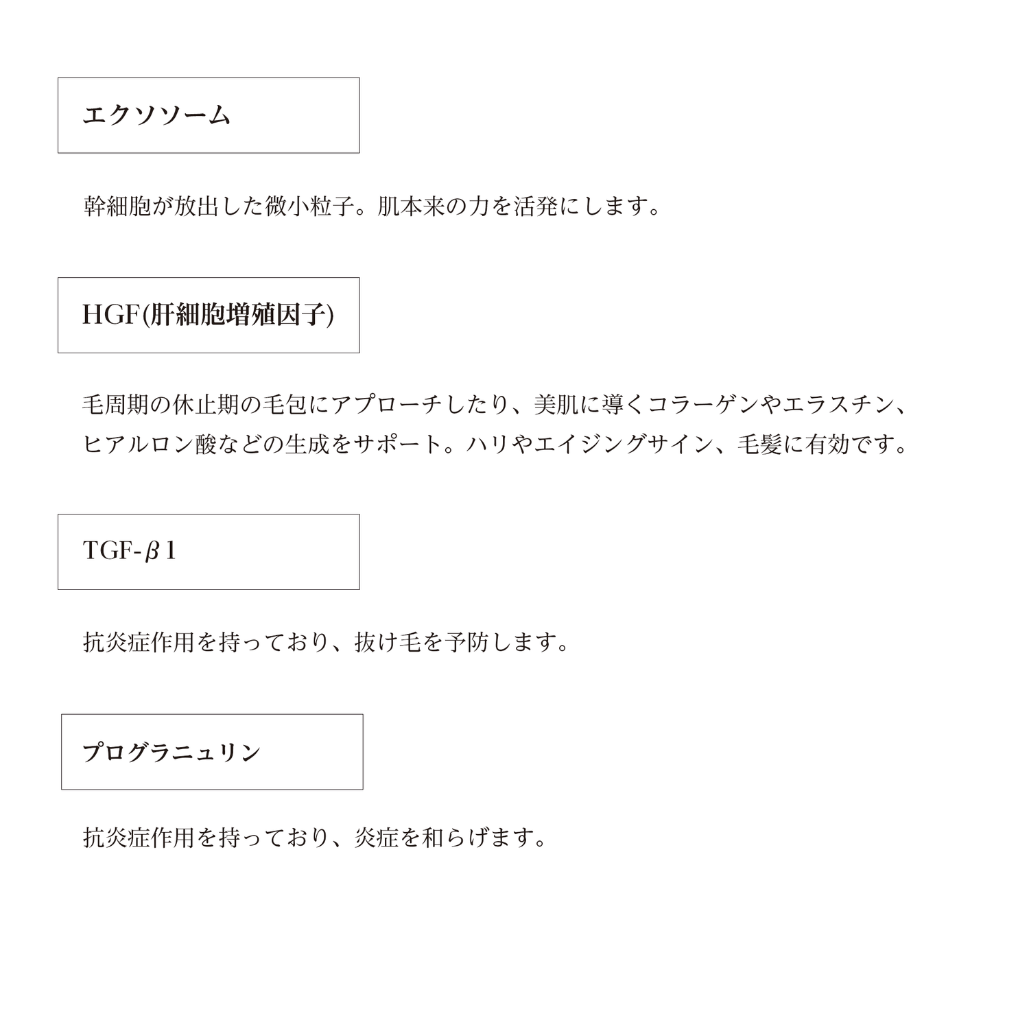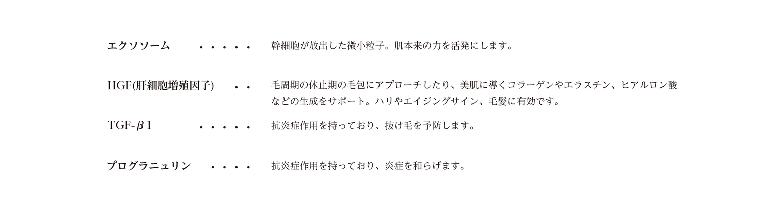 ヒトのプラセンタ(胎盤)から幹細胞を採取し、培養してできた上澄み液のこと。この上澄み液には、からだが持つ本来の力を活発にし、人を美しくそして元気にしてくれる成分が豊富です。
